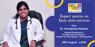 We invite you to join us as we chat with Dr. Hemapriya Natesan, an experienced medical practitioner and certified child nutritionist. You may also know her as the wise, warm mum who blogs about all things health & nutrition at My Little Moppet. Join us as we catch up with her on Aug 28th (Saturday) at 12 noon.